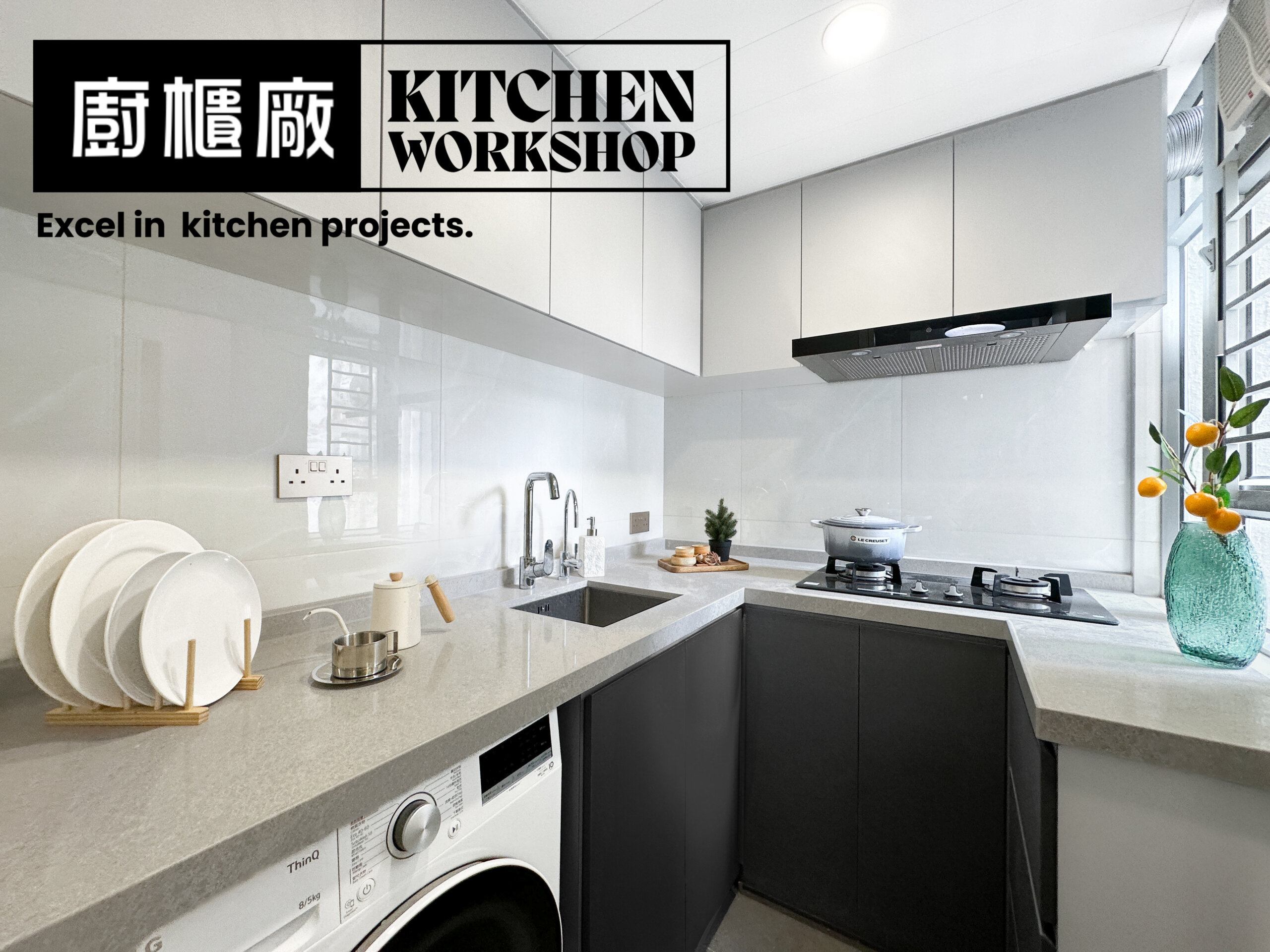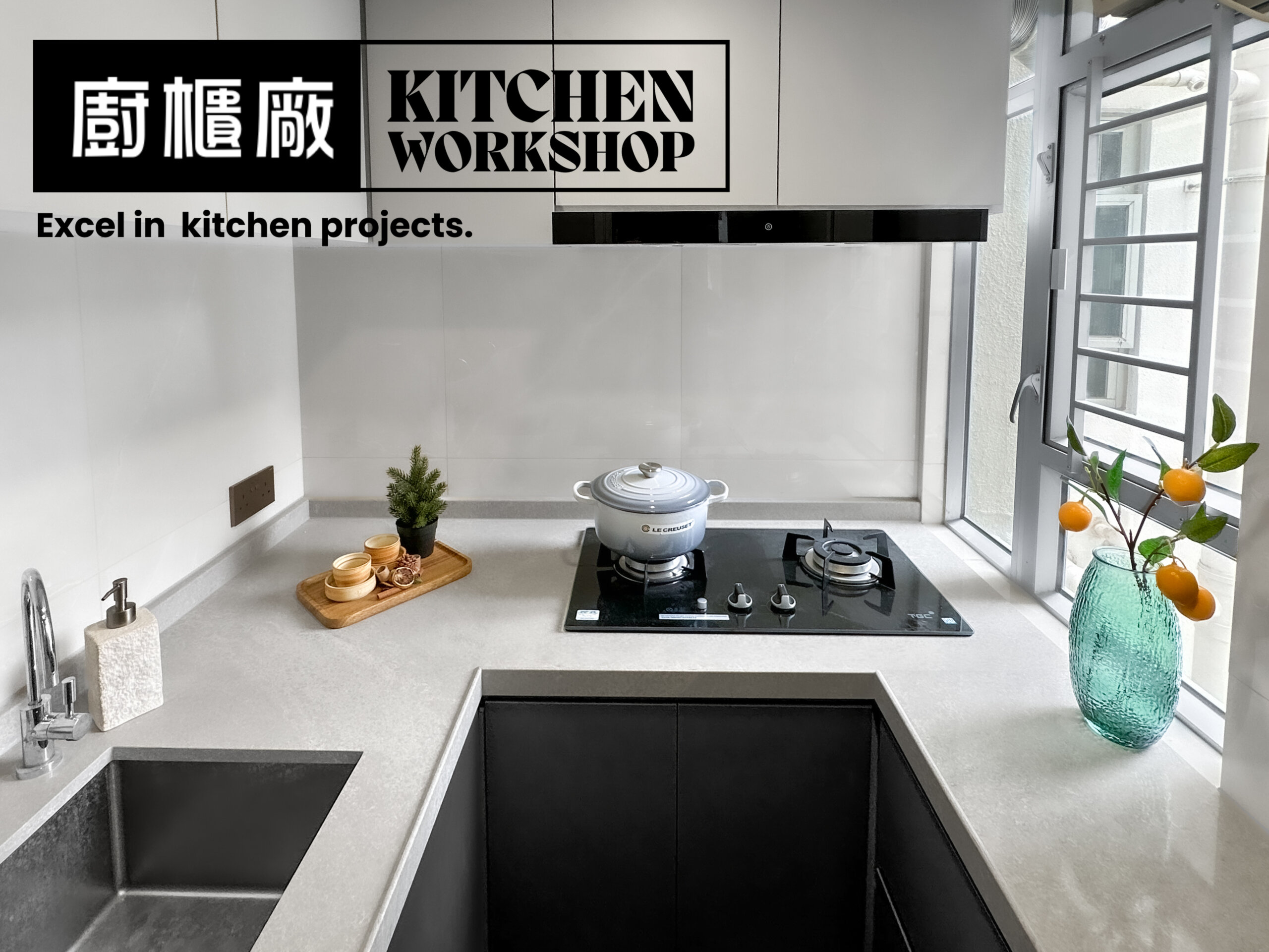 這套現代廚房設計,透過沉穩的深色地櫃與簡潔的淺色吊櫃形成強烈對比,巧妙地創造出豐富的視覺層次感。其簡約外觀呼應假天花和燈槽設計所帶來的獨特光影效果,營造出和諧統一的高級風格。檯面則選用淺灰石紋,增加細節質感,讓空間既清爽又充滿現代美學。
