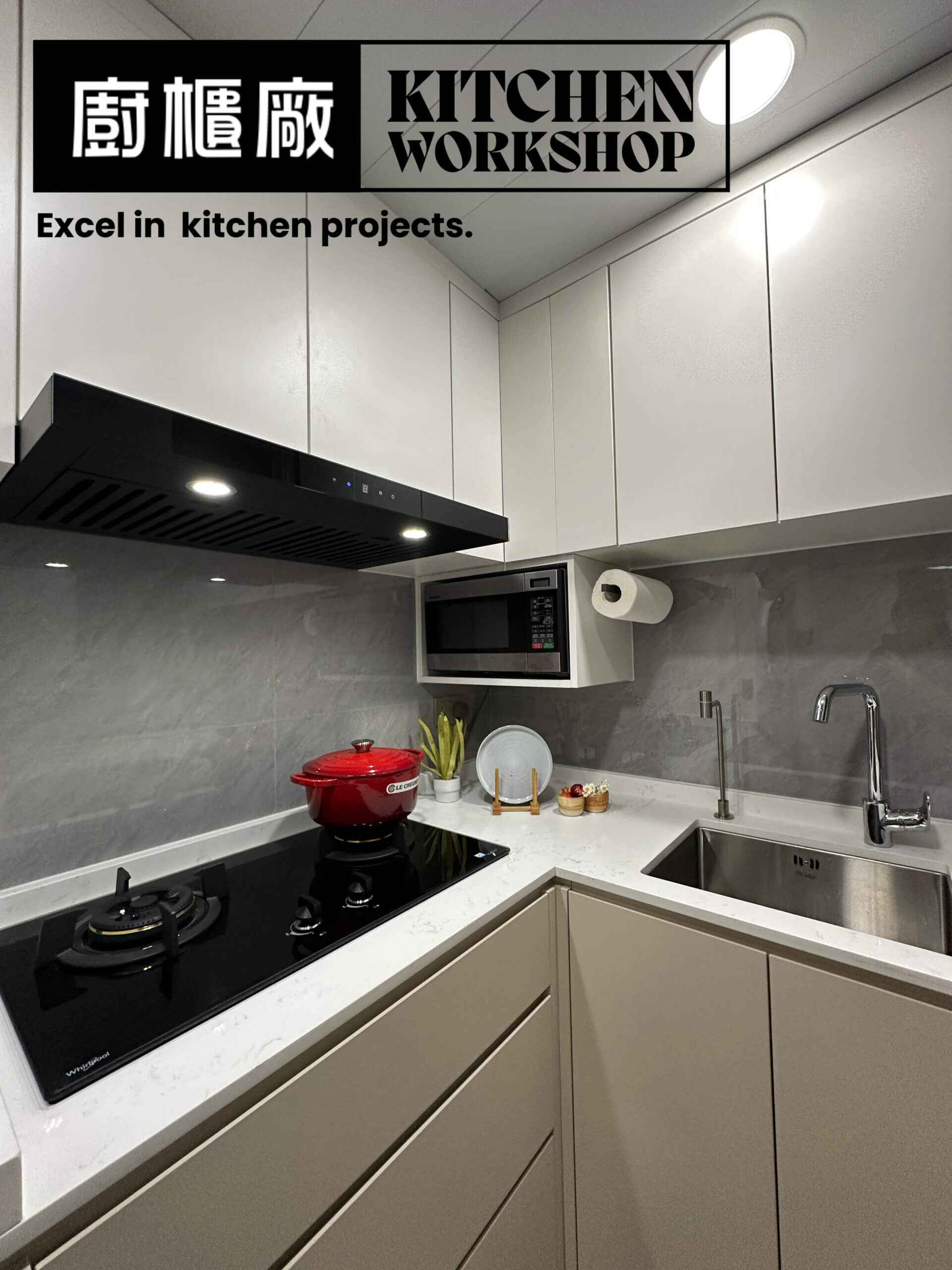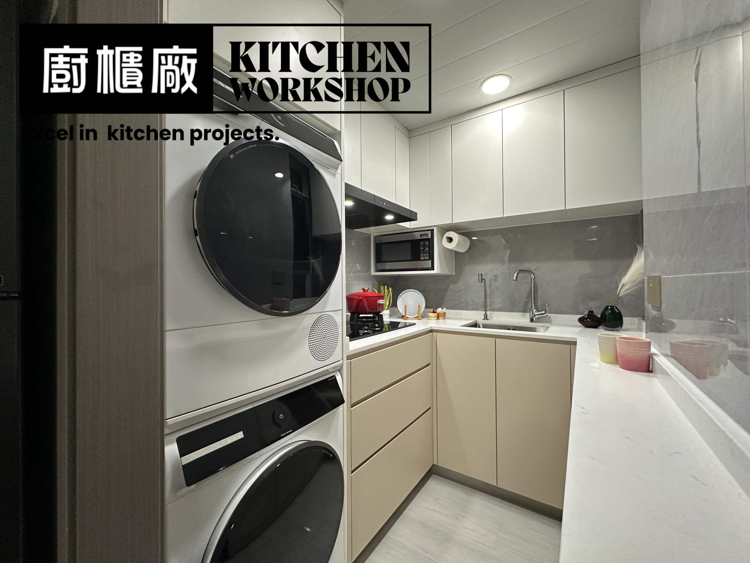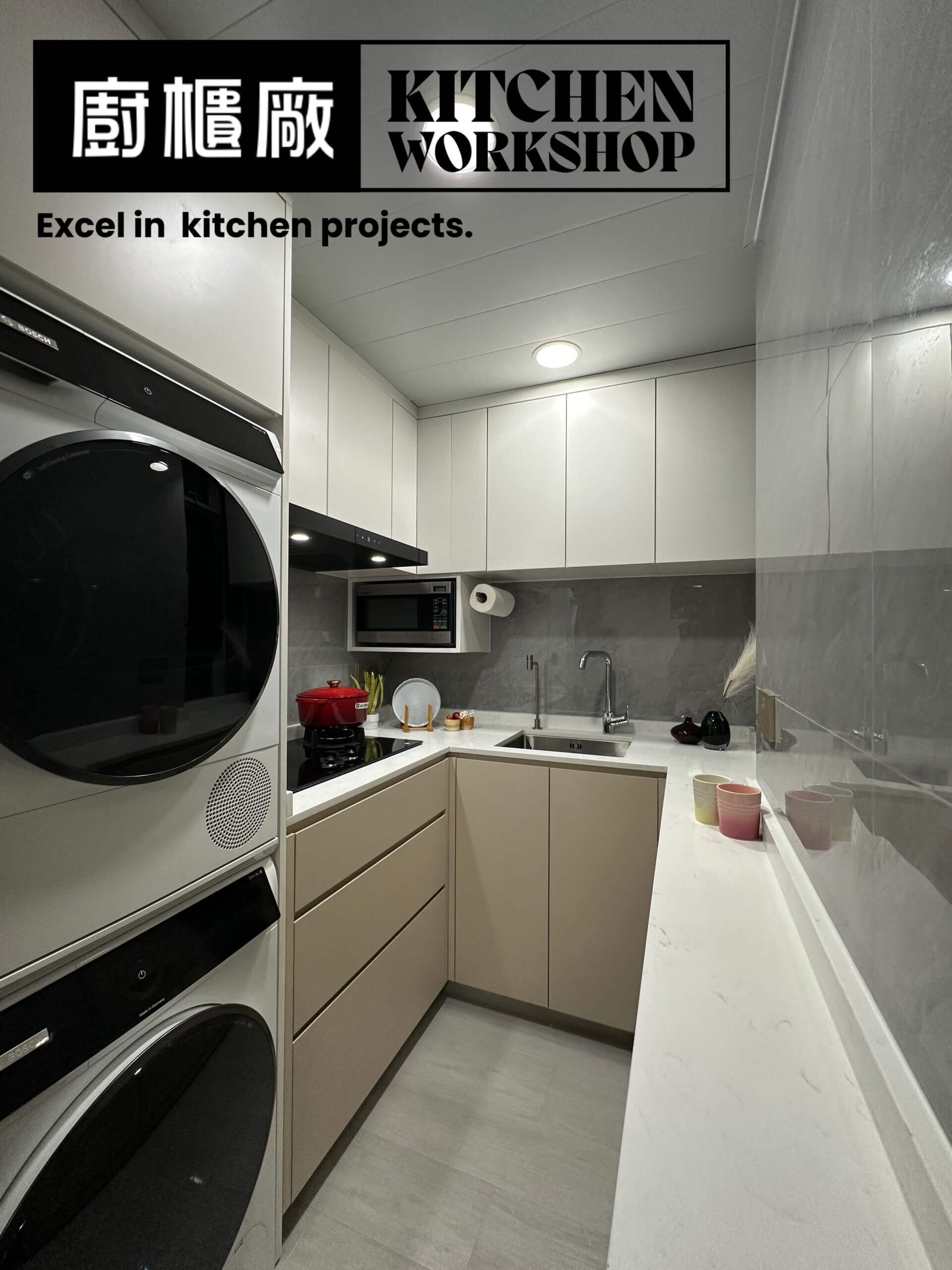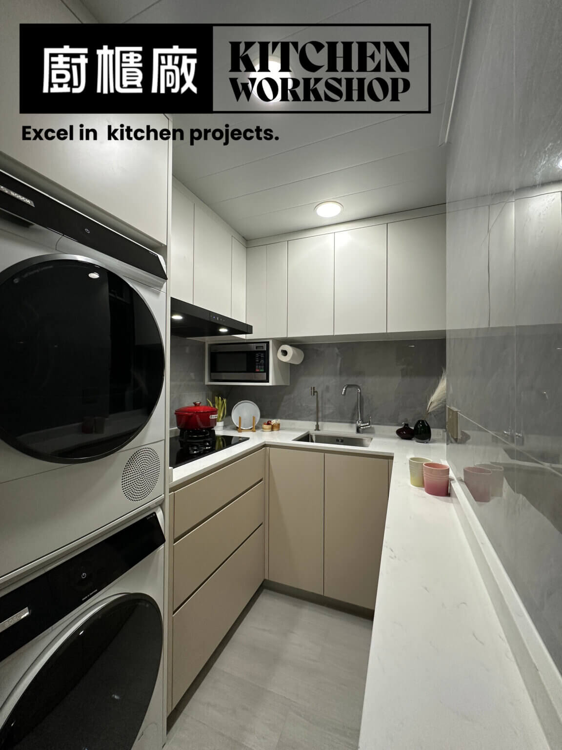 這款廚房設計以不同層次的灰色為主軸,從帶有紋理的櫃體到平光背板,實現了高度和諧的單色調美學。內嵌式雪櫃和無縫設計營造出俐落的現代感。整體風格簡約沉穩,同時透過洗碗機等設備的巧妙整合,展現都會生活對高效實用和精緻品味的追求