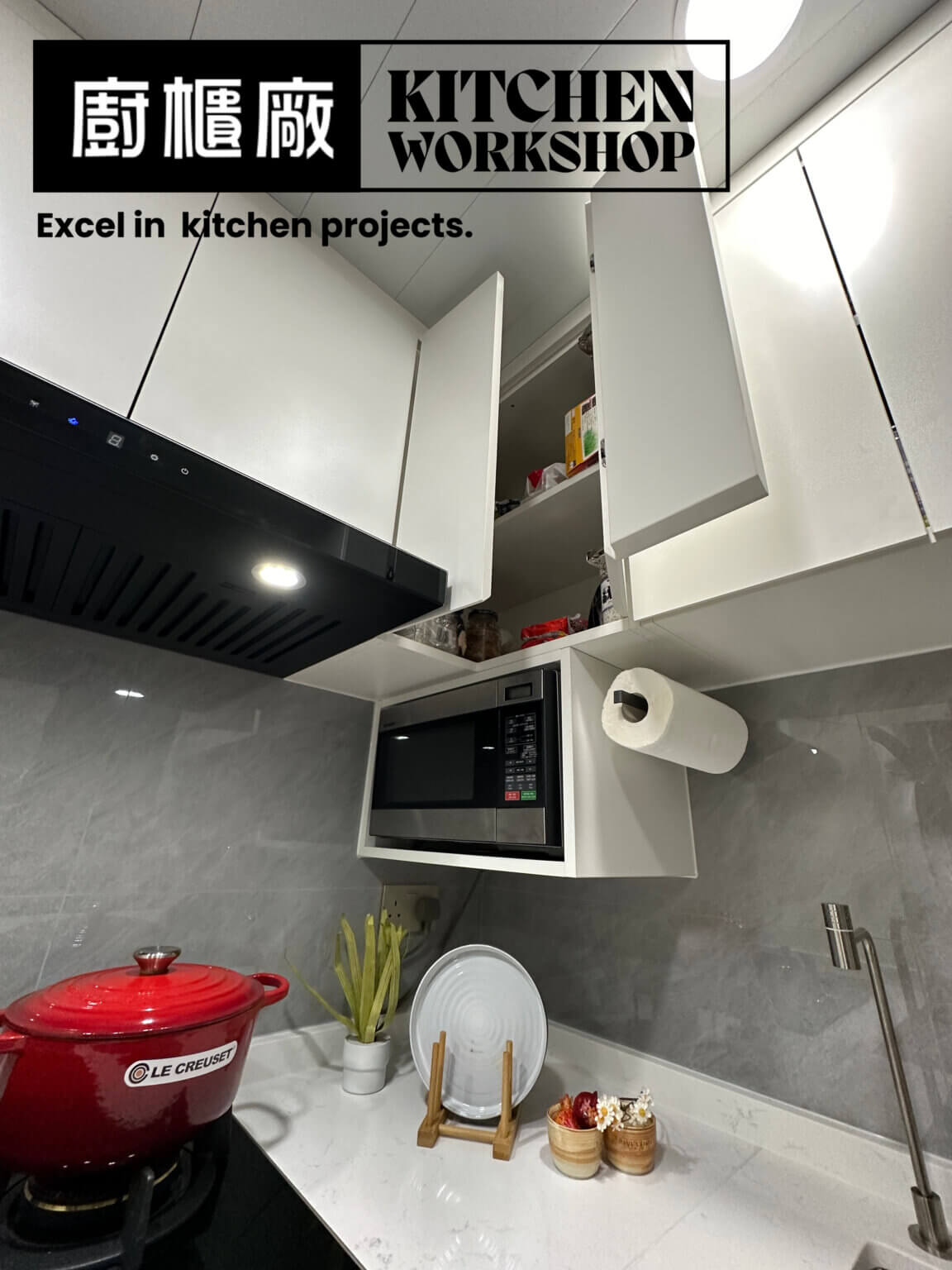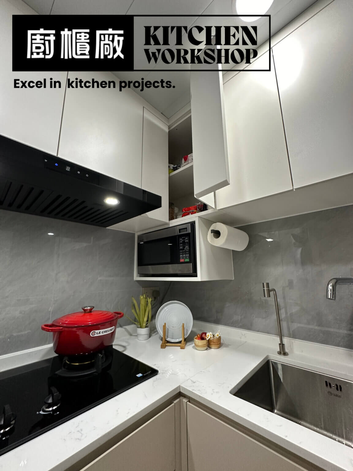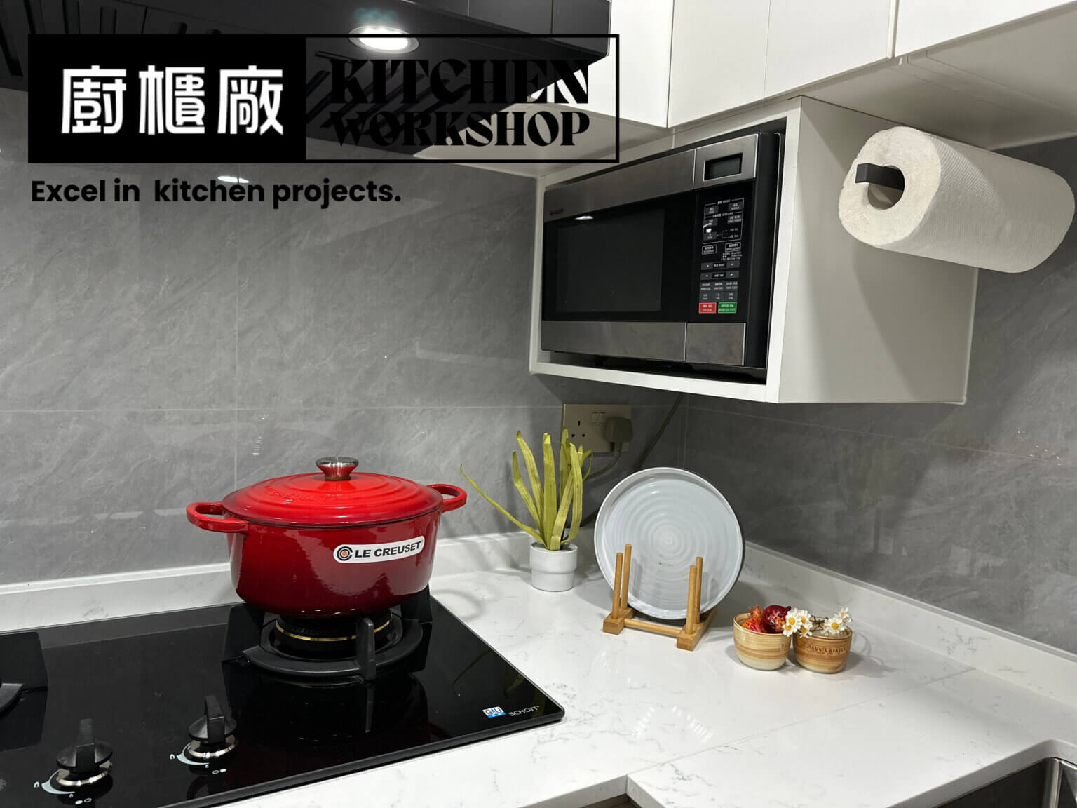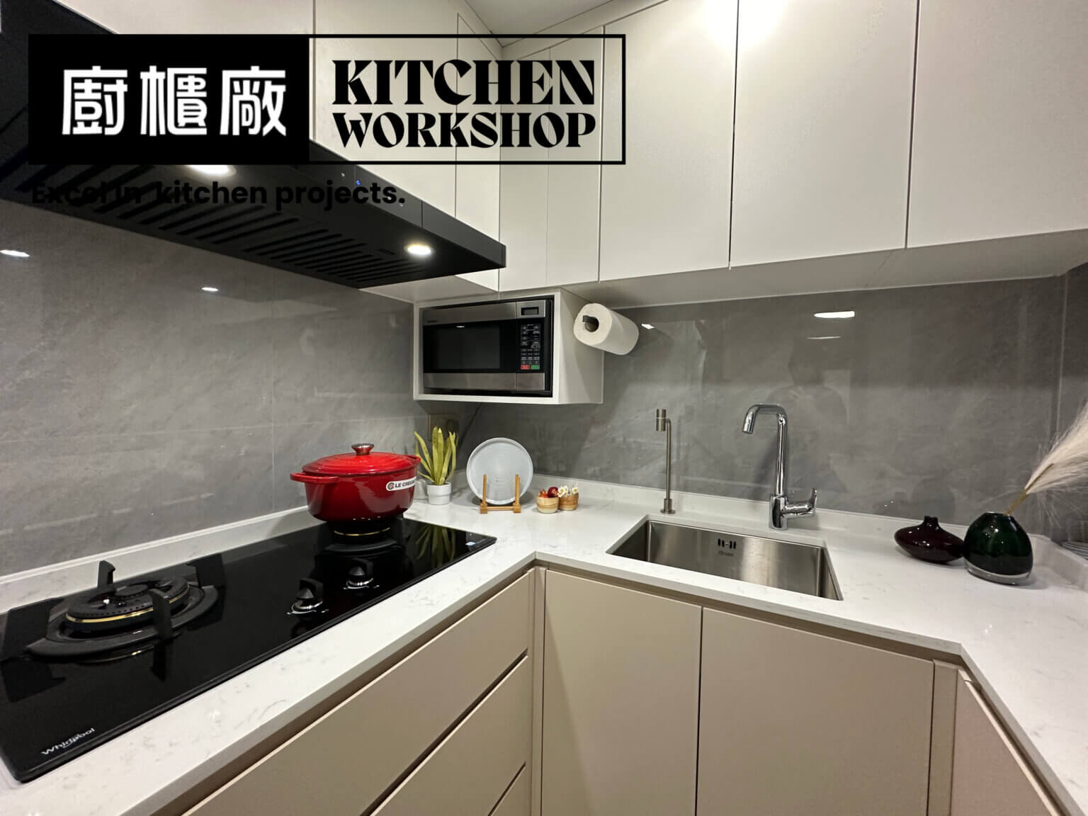 這款廚房設計以不同層次的灰色為主軸,從帶有紋理的櫃體到平光背板,實現了高度和諧的單色調美學。內嵌式雪櫃和無縫設計營造出俐落的現代感。整體風格簡約沉穩,同時透過洗碗機等設備的巧妙整合,展現都會生活對高效實用和精緻品味的追求